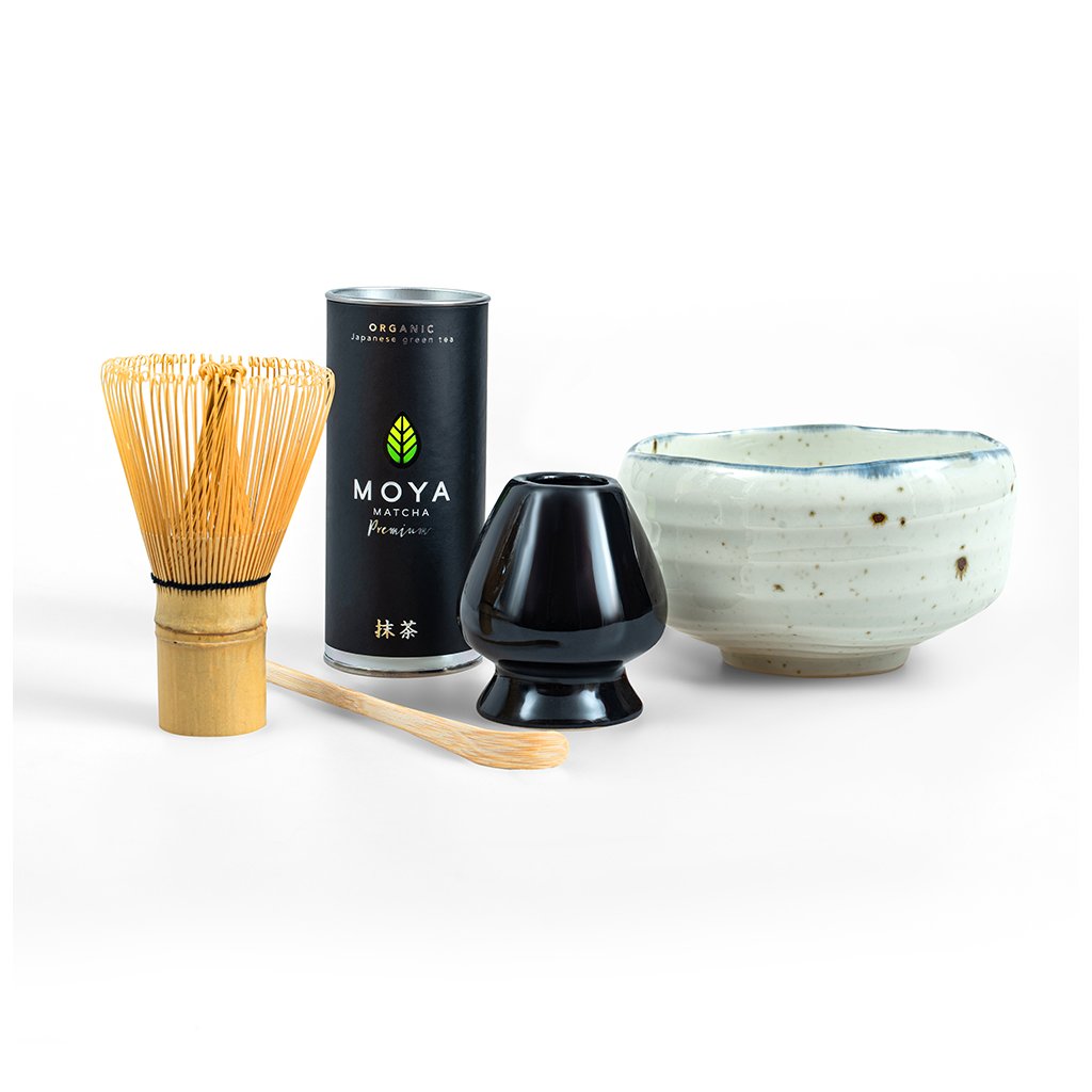 Tradičná sada na prípravu matcha obsahuje: Premium matcha 30 g, chasen, stojanček na chasen, chashaku – bambusovú lyžičku a misku matchawan.