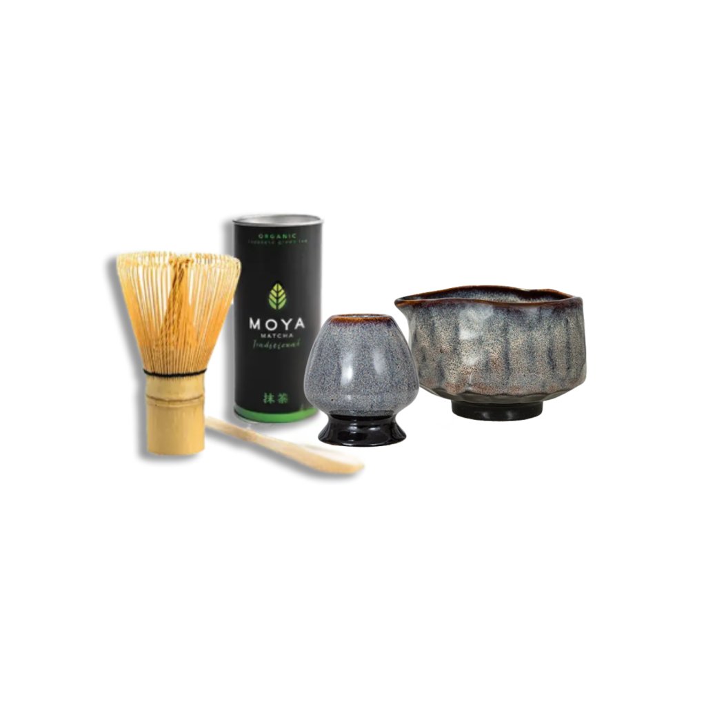 Tradičná sada na prípravu matcha obsahuje: Traditional matcha 30 g, chasen, stojanček na chasen, chashaku – bambusovú lyžičku a misku matchawan.