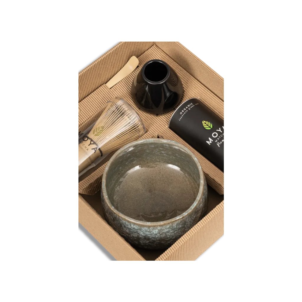 Tradiční sada na prípravu matcha obsahuje: Traditional matcha 30 g, chasen, stojanček na chasen, chashaku - bambusovou lžičku a misku matchawan.
